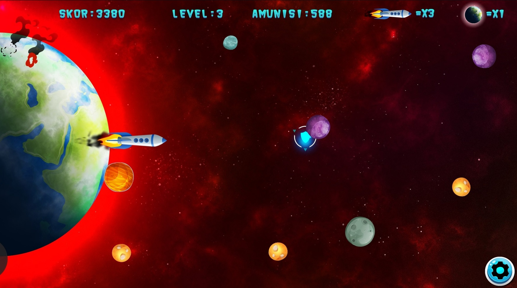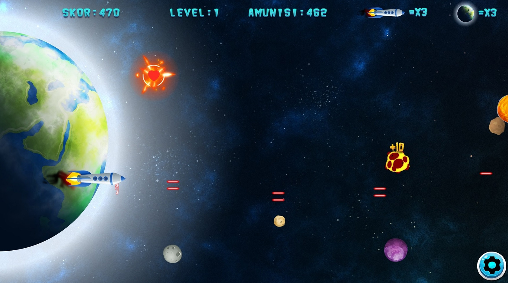 Protect Earth from asteroids as long as possible! You fail the mission after 3 hits or lives lost!